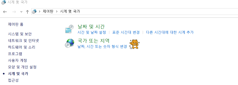 1. 제어판 -> 시계국가 ->국가 또는 지역 언어, 숫자, 시간 및 날짜에 대한 표시 설정