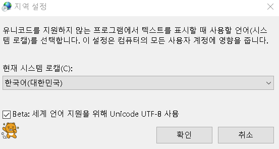 (5) 지역 설정 → "Beta: 세계 언어 지원을 위해 Unicode UTF-8 사용"에 체크한 뒤 [확인] 클릭 →컴퓨터 재부팅