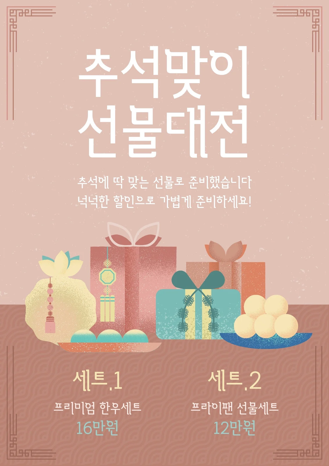 선물세트의 디자인은 고객의 눈길을 끌기 위해 매우 중요해요. 포스터 디자인은 부드러운 핑크색 배경에 전통적인 요소를 가미하여 따뜻한 느낌을 주고 있어요.