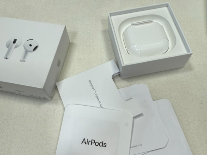- 구성품: 에어팟 4세대 이어폰, 충전 케이스, 사용 설명서 등으로 구성되어 있습니다.