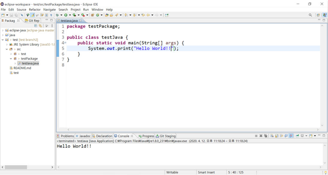 - 상단 메뉴에서 Run > Run을 선택하거나, 툴바에서 실행 버튼을 클릭합니다.