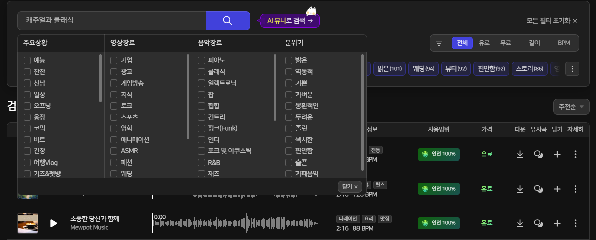 배경음악에 "캐주얼과 클래식"이라고 쓰게 되면 주요상황,영상장르,음악장르, 분위기를 선택하여 좀 더 세밀하게 음악에 접근할 수 있다는데 뮤팟의 매력인 것 같습니다.