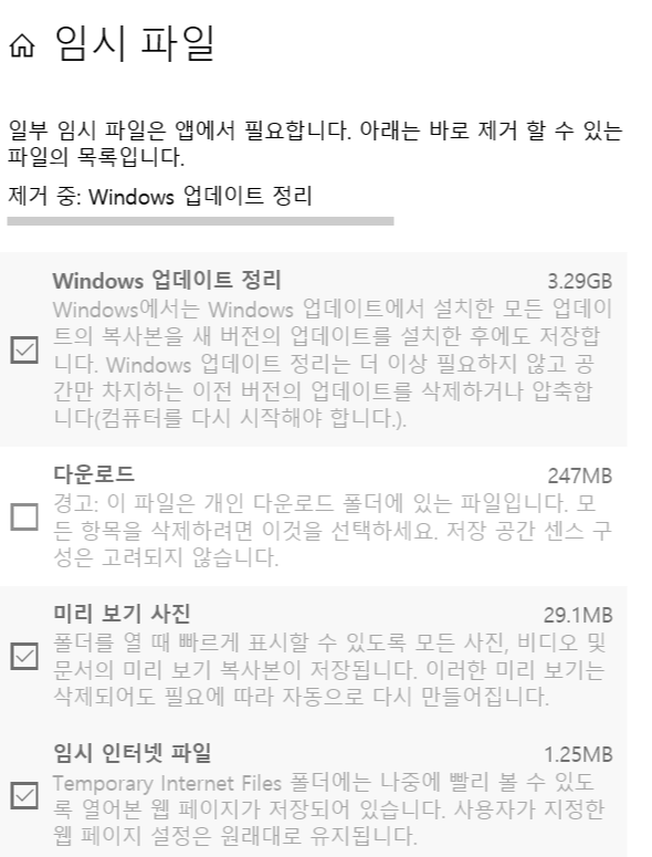 - 임시 파일을 클릭하고, 삭제할 파일 종류를 선택하여 삭제합니다.