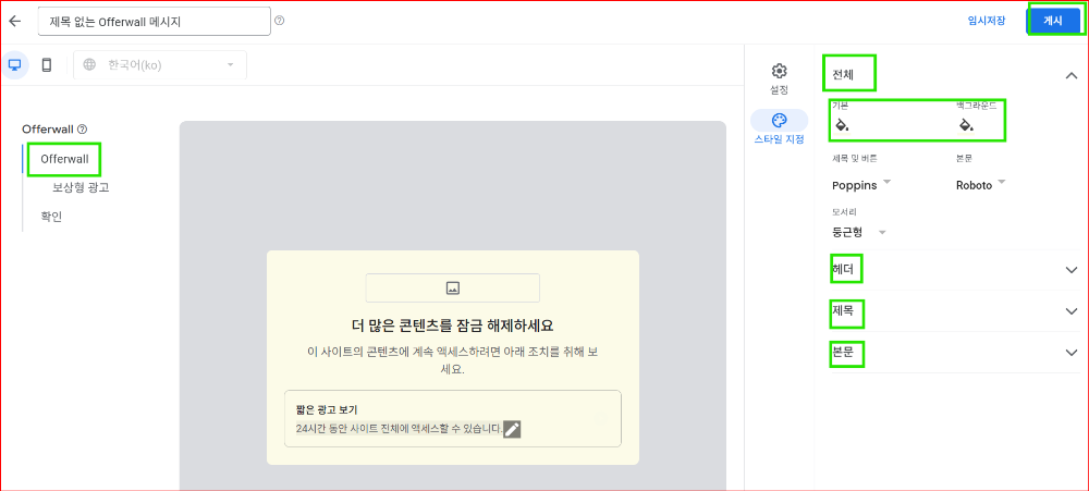 ❷ 페이지 설정: Offerwall 광고를 표시할 페이지를 지정합니다. 블로그 전체에 적용하려면 "[이 섹션의 모든 페이지]"를 선택합니다.